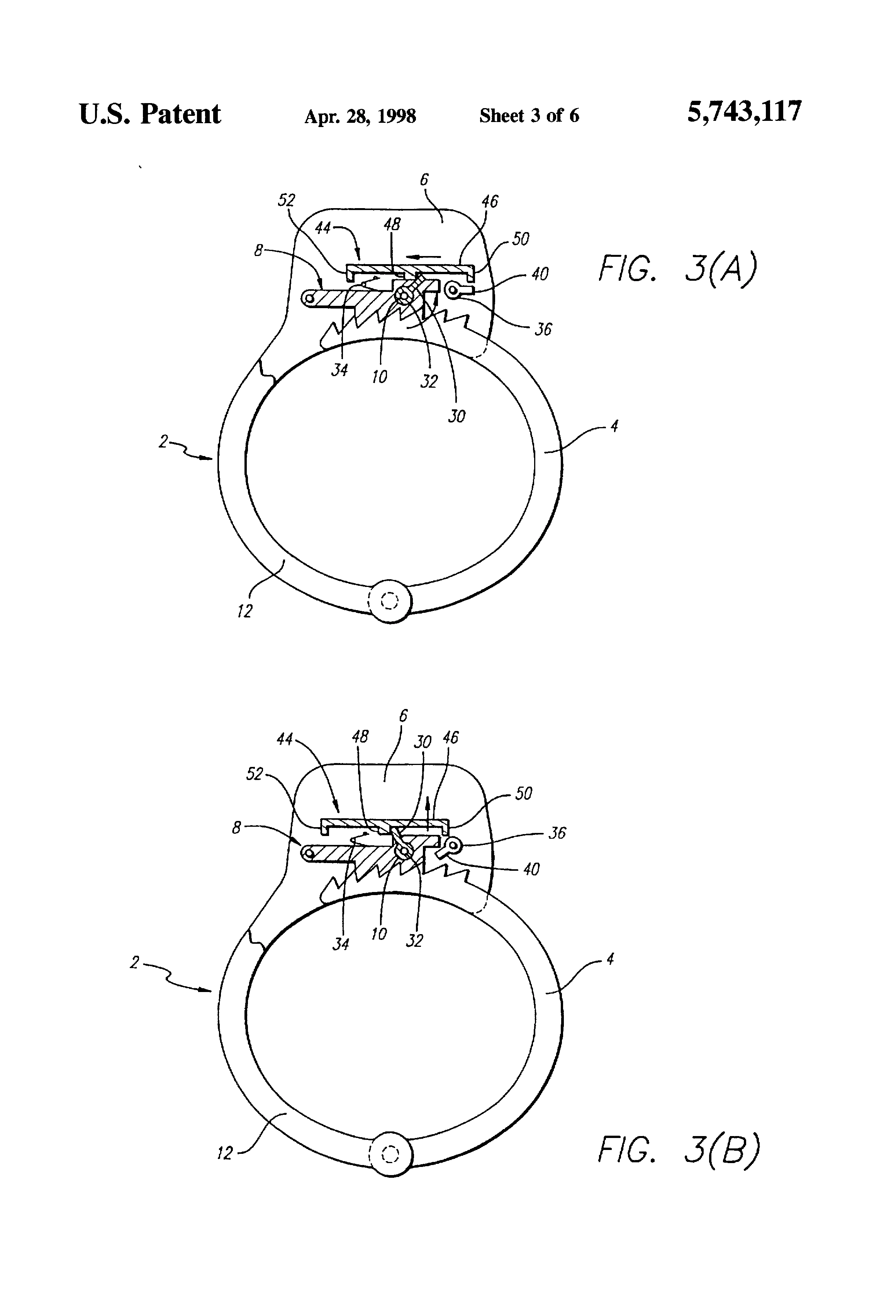 LIG. 1 (A) yog qhov yooj yim pom kawg ntawm lub khauj tes uas qhia cov kab uas siv ob sab ntawm lub ntsej muag uas muaj ob rab hle nrawm sib txuas thiab cov pob qhov rooj txuas rau ntawd, tus tswvcuab mus pov tseg ntawm cov phaj sab thiab ib tus yuam sij siv los ntsuas thiab xauv tus tes xauv.